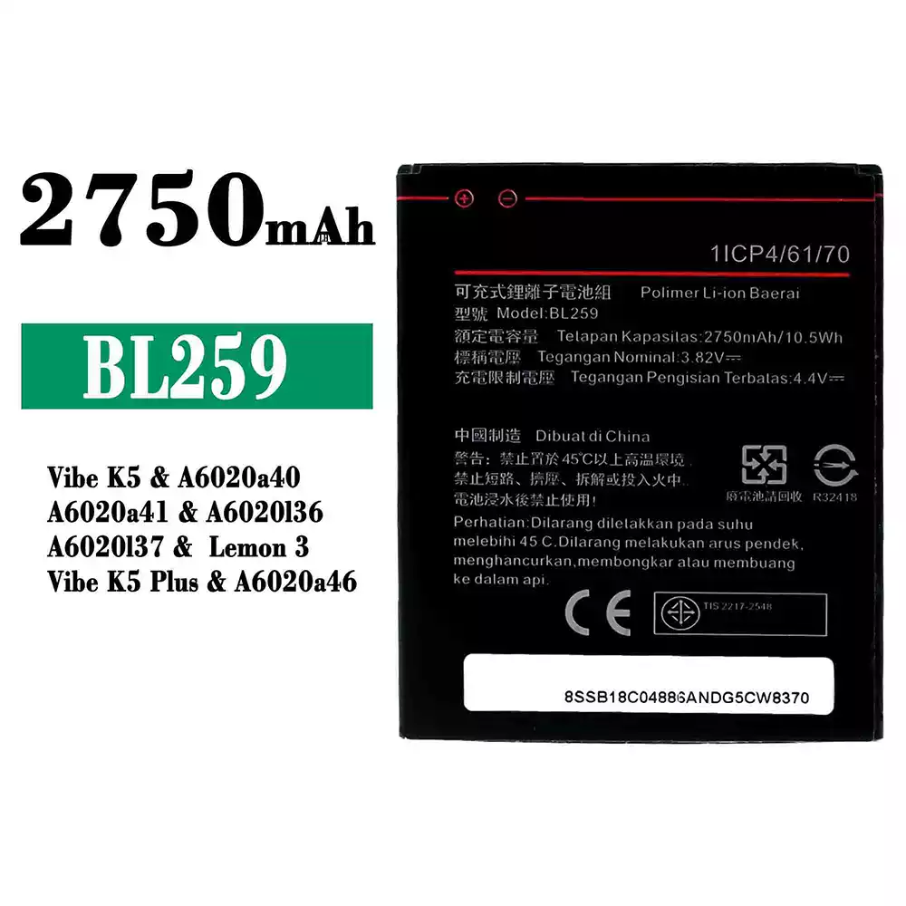 電池 BL259 適用於 Lenovo Vibe K5 / A6020a40 / A6020a41 / A6020136 / A6020137 / Lemon 3 / Vibe K5 Plus / A6020a46