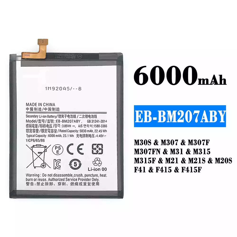 電池 EB-BM207ABY 適用於 Samsung M30S/M307/M307F/M307FN/M31/M315/M315F/M21/M21S/M20S/F41/F415/F415F